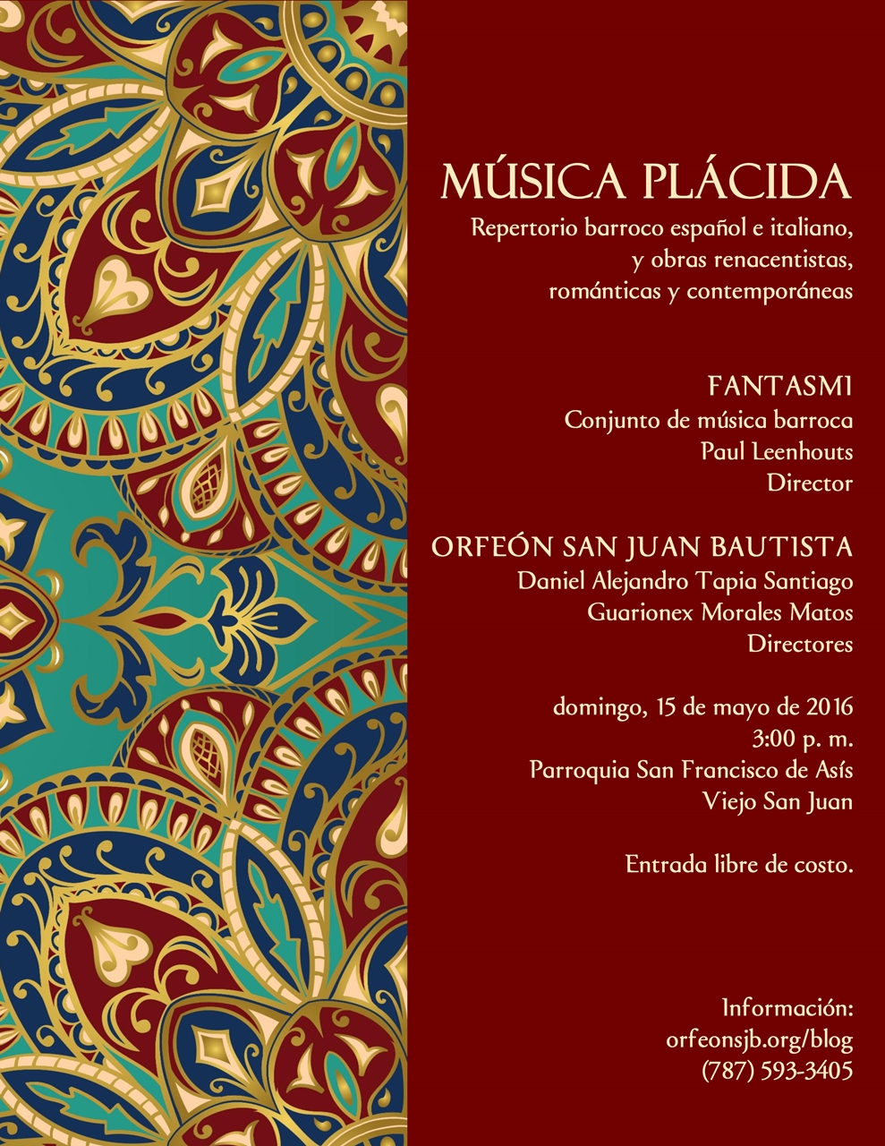 El Orfeón San Juan Bautista finaliza su decimoquinta temporada artística en la centenaria Parroquia San Francisco de Asís, en el Viejo San Juan. Gran parte del programa estará a cargo de Fantasmi, conjunto especializado en música barroca. El quinteto, con sede en Texas, visita por primera vez la Isla y presentará un repertorio integrado por música española e italiana. La dirección de Fantasmi está a cargo del profesor Paul Leenhouts, director del Programa de Estudios en Música Temprana y la Orquesta Barroca de la Universidad de North Texas. La ocasión ofrece una oportunidad especialísima de disfrutar de esta música, raras veces ejecutada en Puerto Rico. Fantasmi ha preparado para este concierto obras de Alessandro Stradella (1639-1682), Ignazio Albertini (1644-1685), José de Torres y Martínez Bravo (1665-1738), Giovanni Antonio Bertoli (c. 1645), Michelangelo Rossi (c. 1601-1656), Angelo Berardi (1636-1694), Tomás Torrejón y Velasco (1644-1728), Alessandro Scarlatti (1649-1725), Biagio Marini (1594-1663), Giovanni Felice Sances (c. 1600-1679) y Tarquinio Merula (c. 1594 – 1665).